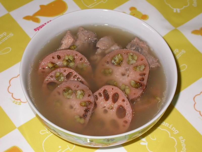 (1)绿豆用冷水泡一个小时,待用。 (2)猪骨飞水,待用。 (3)把绿豆塞入莲藕中,莲藕头尾用牙签穿插,以防绿豆掉出来。 (4)把所有材料加水煲1个小时,然后把莲藕取出,切片,再放入汤中煲10分钟,调味即成。