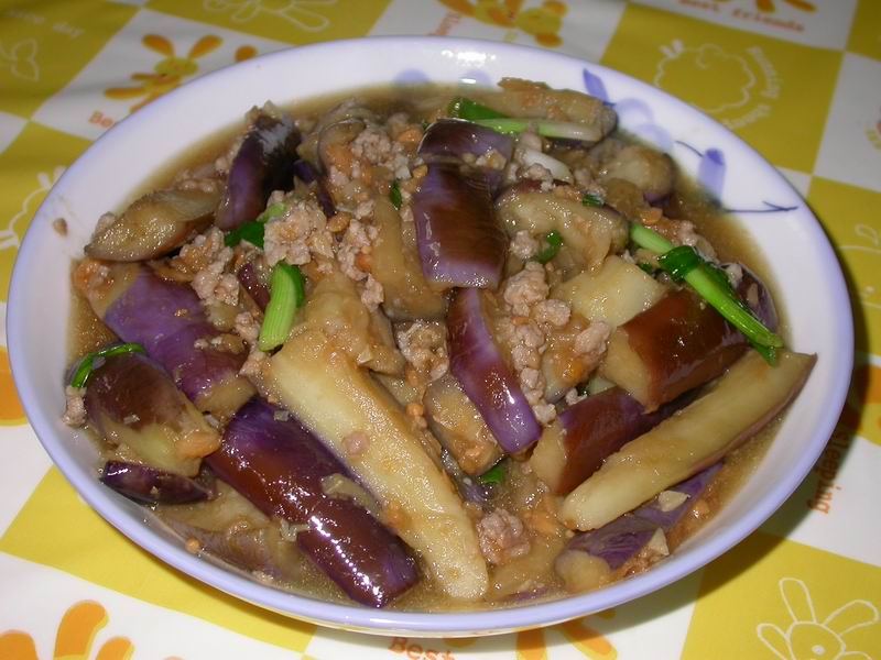 材料:茄子4条,咸鱼2小块(预先蒸熟切碎备用),肉碎150克(预先调味)