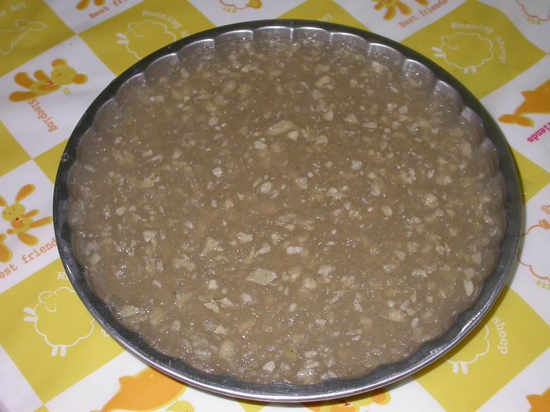 稍冷却即倒入余下的生浆,与熟浆混合搅匀,再将马蹄丁拌入,然后倒入蒸盘,
